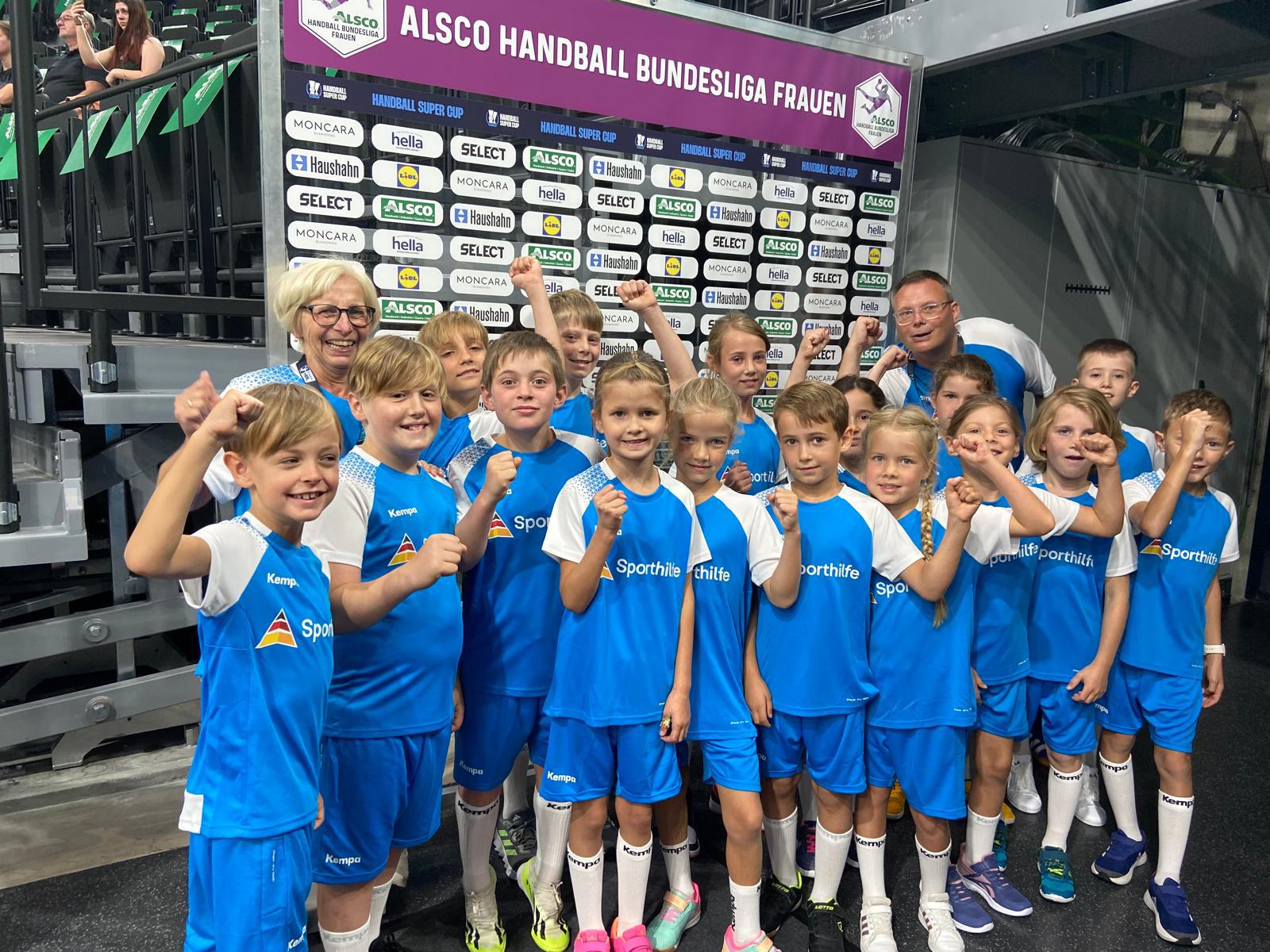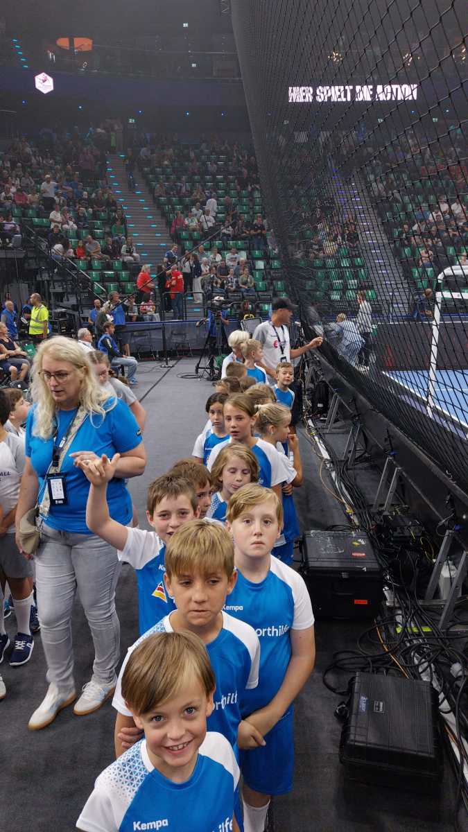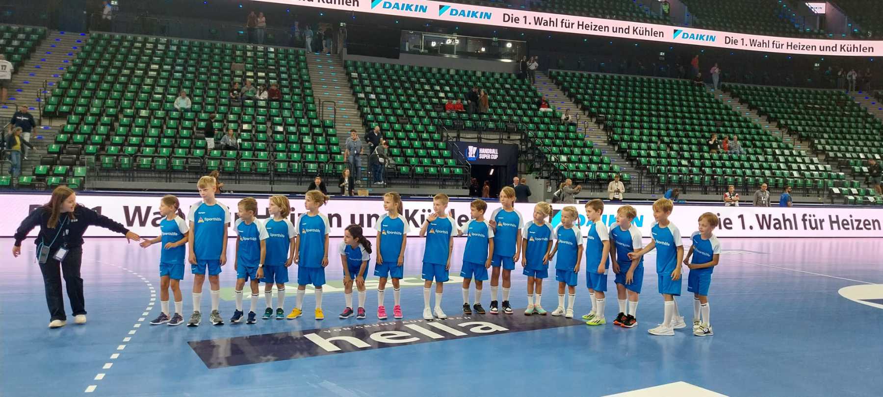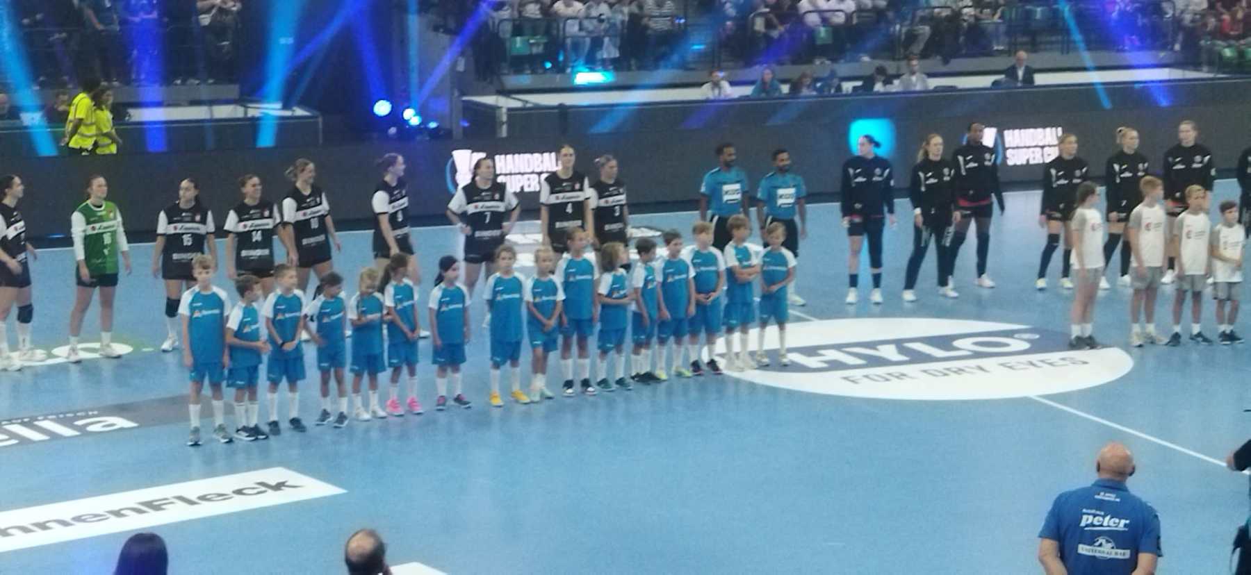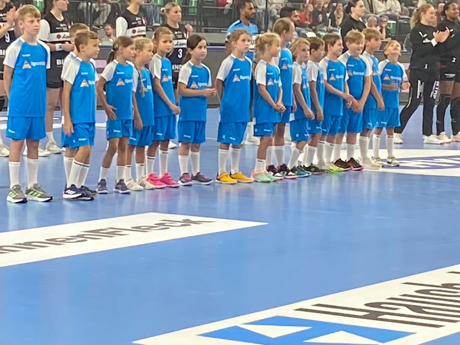 16 Einlaufkinder der 3 HSG-Mini-Spielgruppen und der 3 HSG-E-Jugend-Spielgruppen durften am Samstag, den 23.8.2025 mit dem Damenteam der HSG Blomberg-Lippe mit einlaufen.