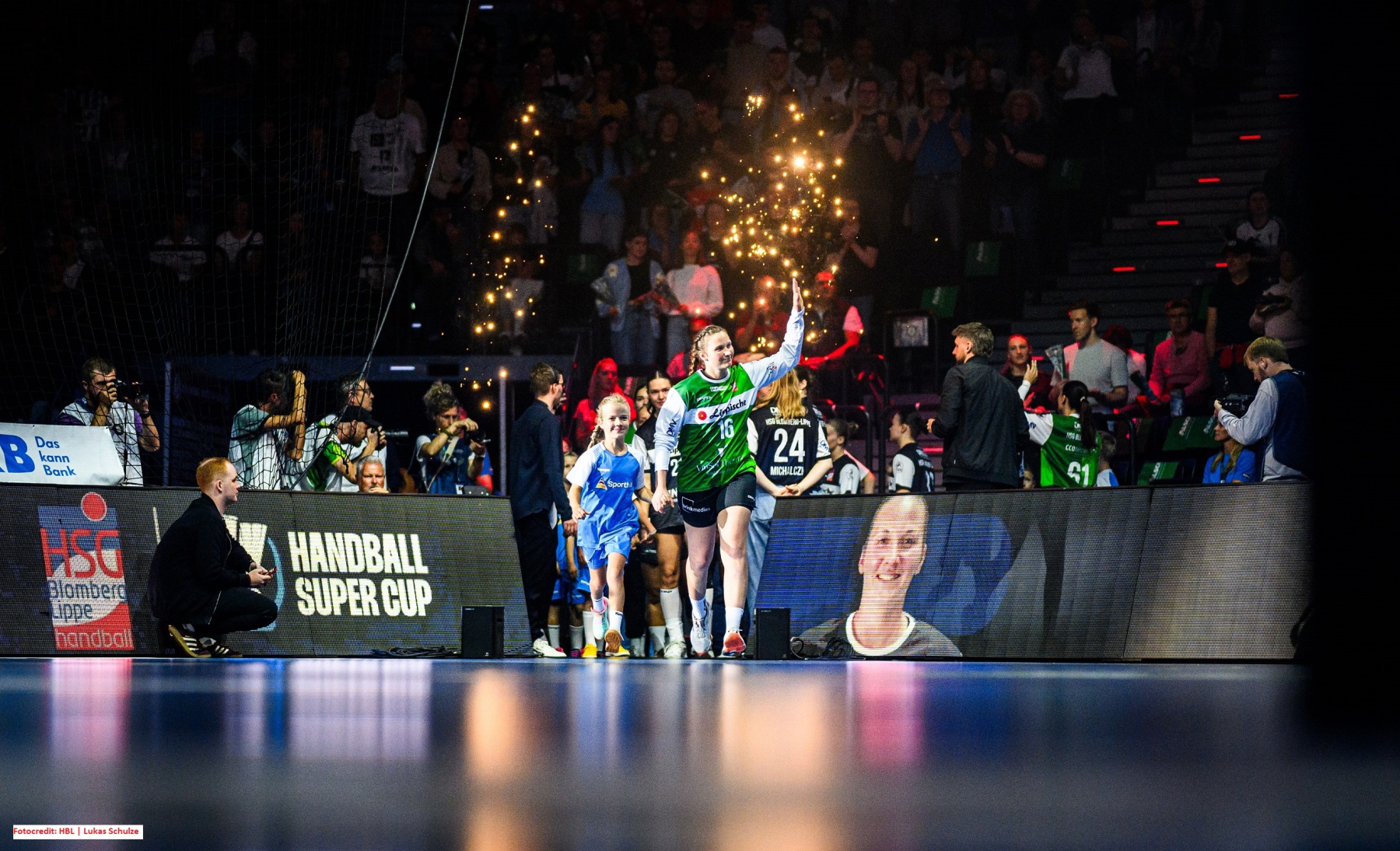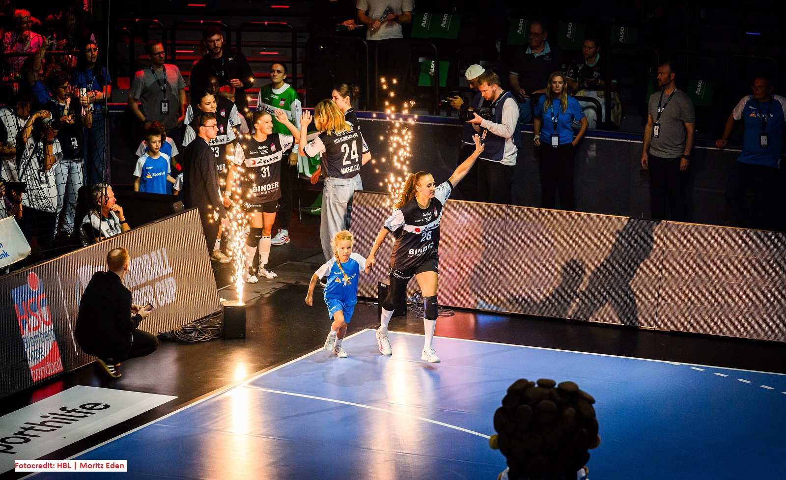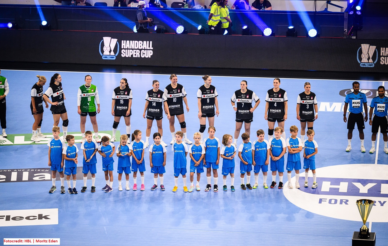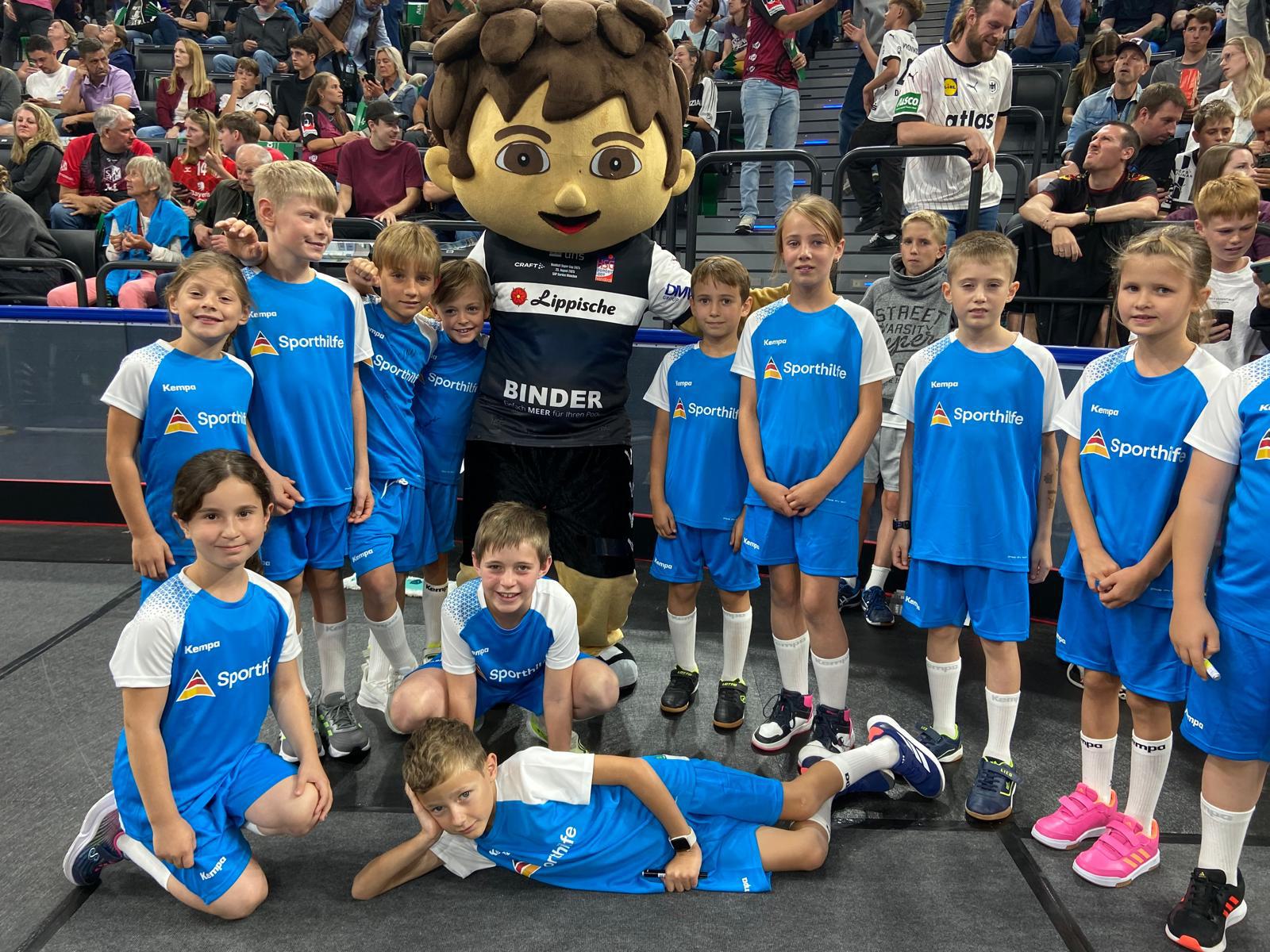 16 Einlaufkinder der 3 HSG-Mini-Spielgruppen und der 3 HSG-E-Jugend-Spielgruppen durften am Samstag, den 23.8.2025 mit dem Damenteam der HSG Blomberg-Lippe mit einlaufen.